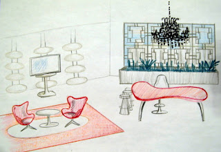She also wanted bright red accents and furniture with a high gloss flooring in white, which would no doubt, be a challenge!